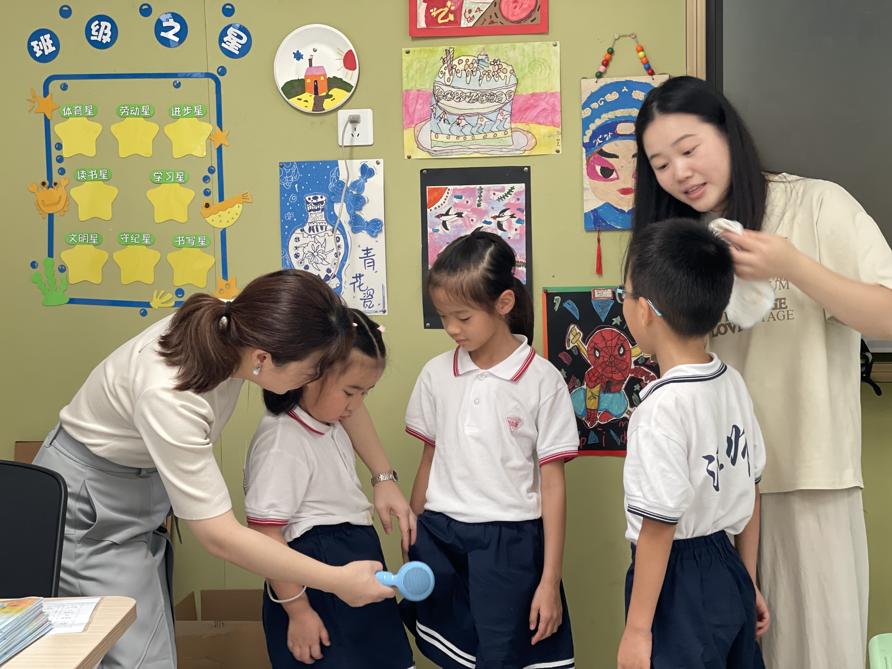 上海市徐汇区汇师小学教师使用吹风机、小毛巾等工具,教师用吹风机将孩子们湿漉漉的头发一根一根地吹干。