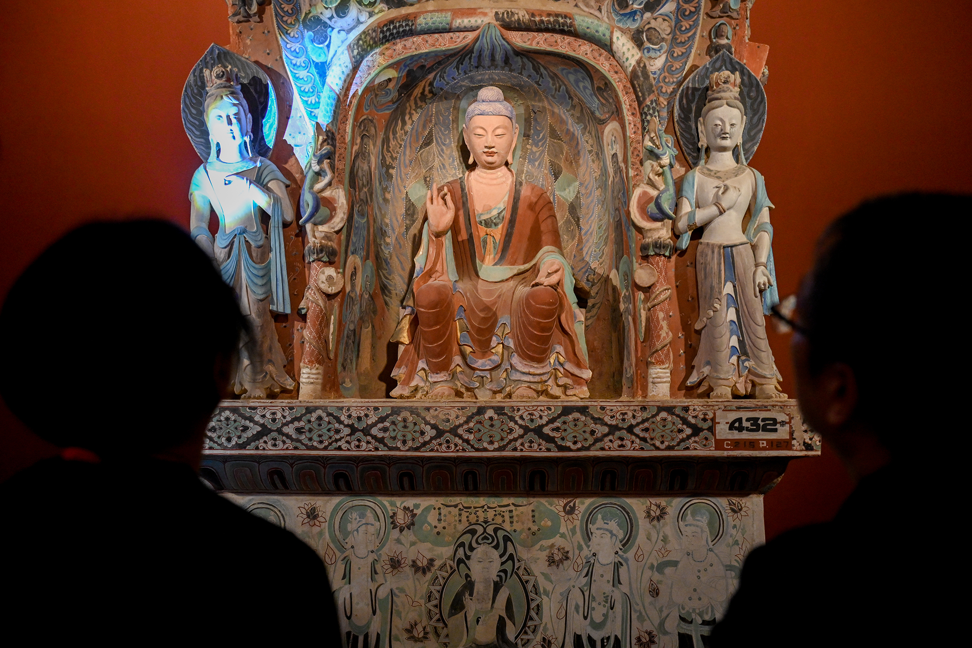 参观莫高窟第432窟第432窟,2024年9月20日,上海,中华艺术宫。 西魏佛菩萨雕像(中心柱)复制品。本报记者 朱伟辉 图
