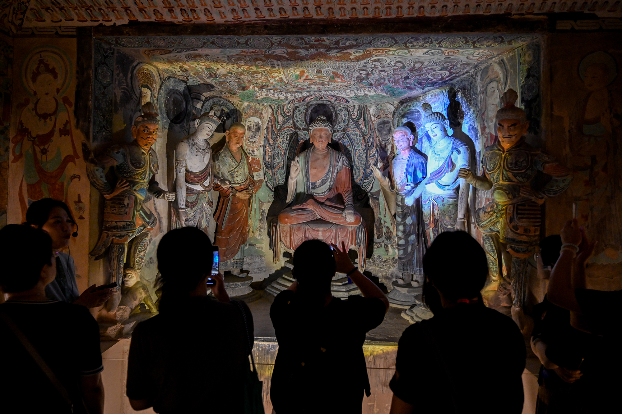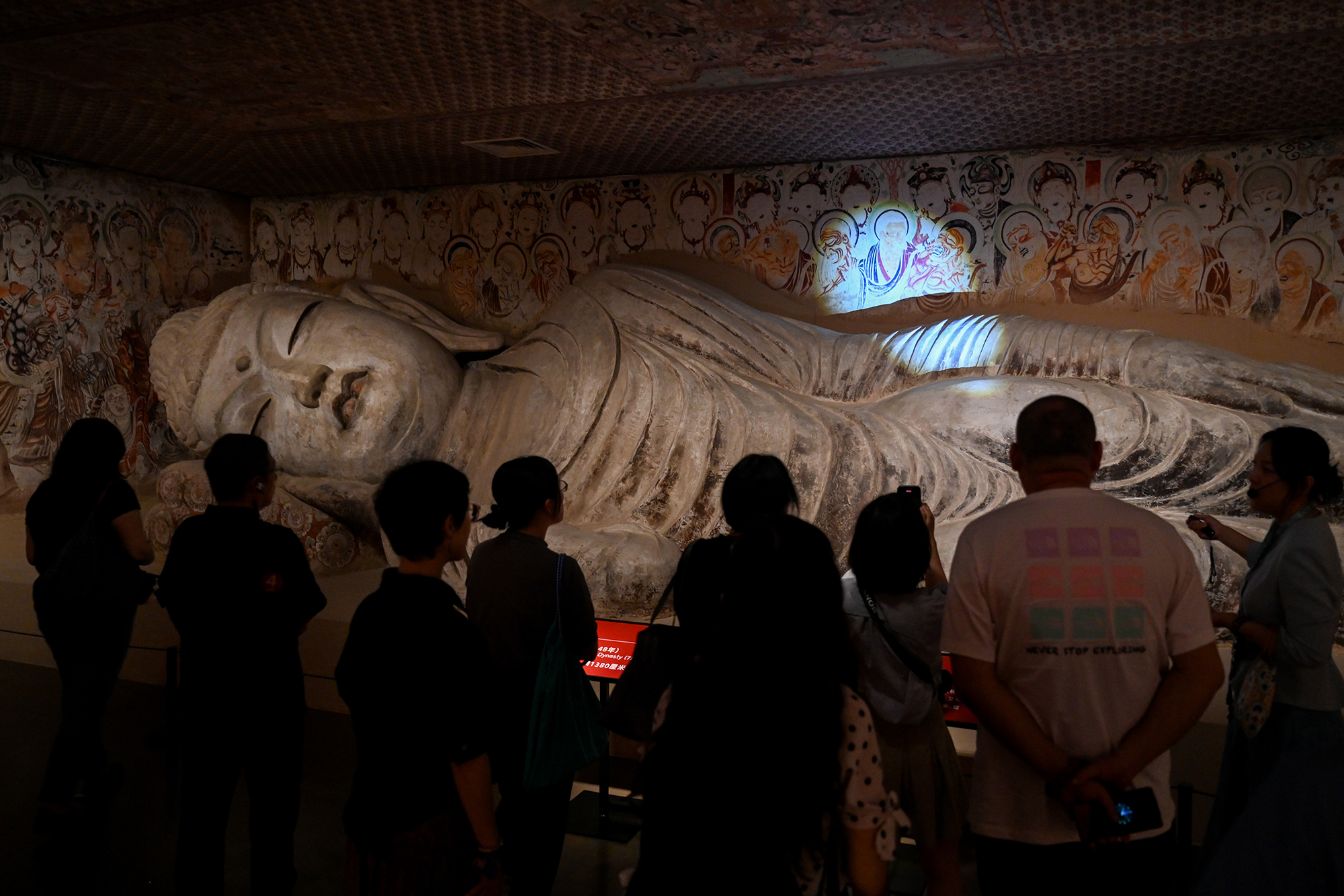 2024年9月20日,来自上海、中华艺术宫的游客参观了中唐第158窟的“最美涅盘佛”。本报记者 朱伟辉 图
