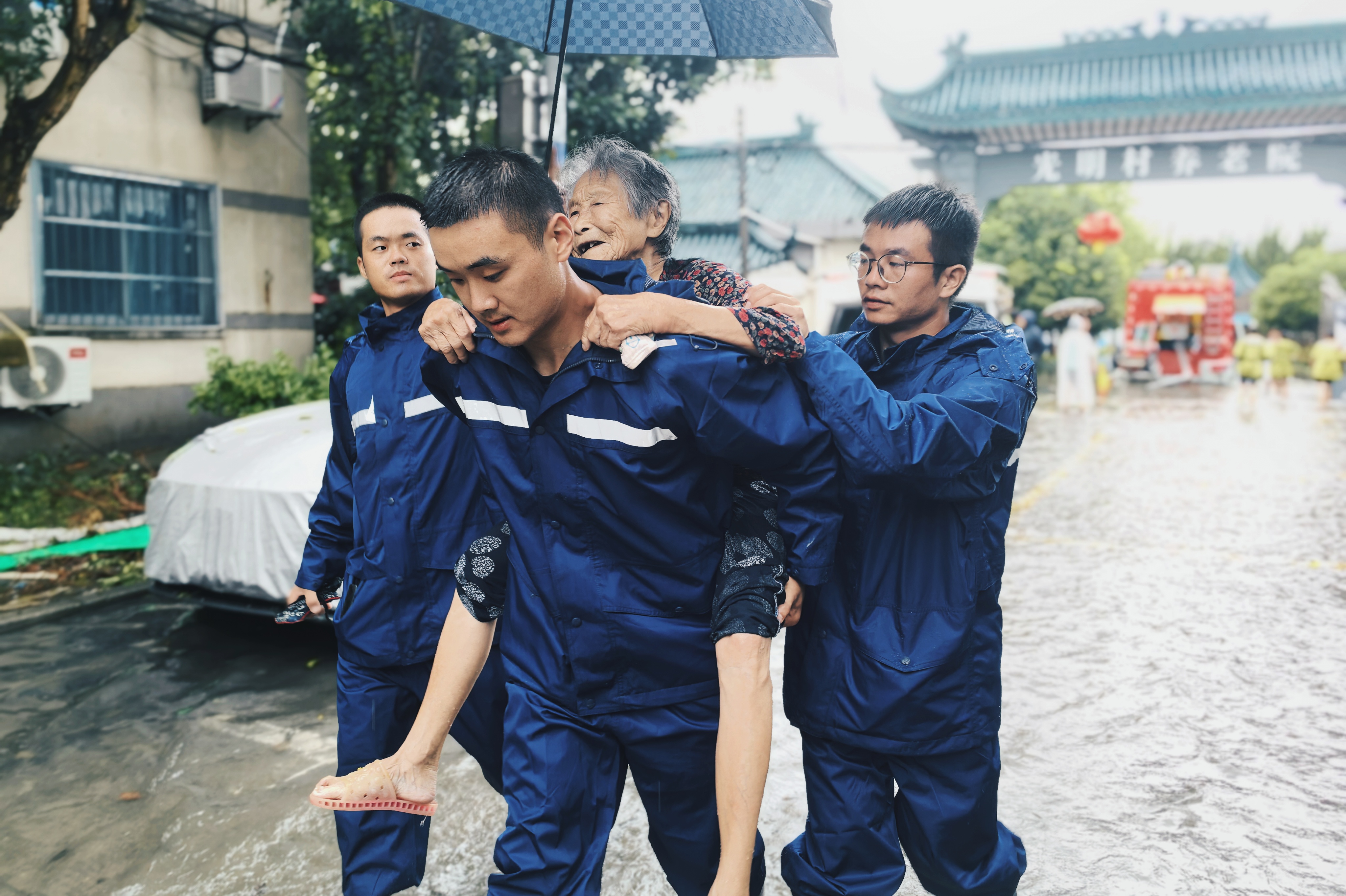 总是有老人家属不放心,希望把老人带回家。防火人员背着老人,借着雨小一点的空隙,将其运出养老院。