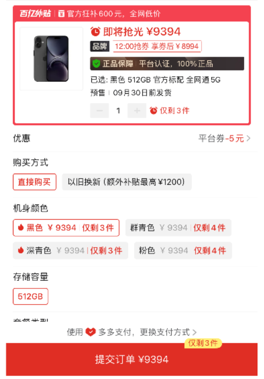 对iPhone来说 16和iPhone 16 Plus,“黄牛”不收货,iPhone 16 大部分Pro原价回收或涨价30~50元。事实上,目前多家电商平台已经掀起了一场补贴战,特别是拼多多,iPhone 16网站首发价格5999元起,拼多多狂跌600元;iPhone 16 Plus官网首发价格为9999元(512GB),在拼多多补贴价格之后,节省了1000元,因此,在正式发售之前,两款车型都面临着“破发”(指二级市场价格跌破发售价格)的局面。