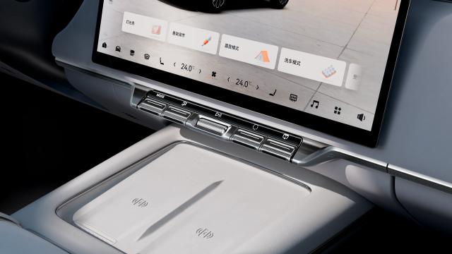 7X 方向盘没有使用 X 和 007 同款的遥杆 触摸,而是和谐 001 同样的物理按钮。中控台下面还有五个物理按钮,质感很好,可以调节性能模式和音乐,也可以把定制按钮绑在空调上调节温度。