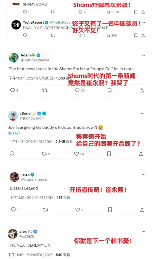 伴随着崔永熙加盟篮网迎来官方宣布,他也立即点燃了网络。一些球迷在社交媒体上写道:Shams 时代的第一个消息其实是崔永熙,我哭了!有粉丝感慨地说:终于又有一个中国球员了,好久不见!最让人感动的是一个粉丝写道:你是下一个林书豪!