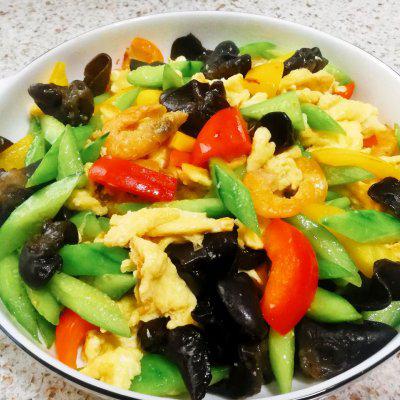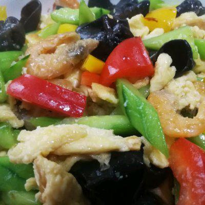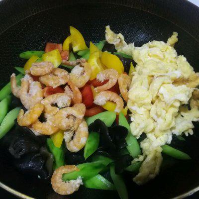 9、加入彩椒、虾、煎蛋。