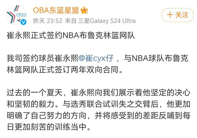 崔永熙正式与 nba签了一份为期两年的双向合同,本赛季将前往北美开始一次全新的梦想建设之旅。