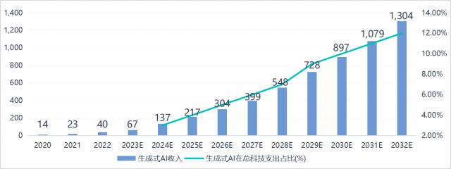 图表 1:2020-2032E 全球生成式 AI 收入和预测(单位:10 亿美金)