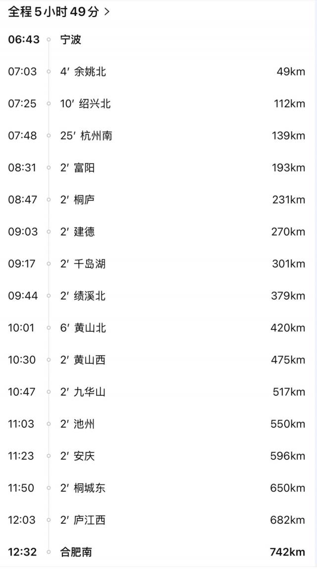 G9318 第二次到达宁波杭州南站后,将沿杭黄(杭州) - 黄山)高铁运行,6:43 从宁波出发,8:47 抵达桐庐,9:03 抵达建德,9:17 到达千岛湖,10:01 到达黄山北部,10:30 到达黄山西,10:47 到达九华山,最后到达 12:32 抵达合肥南站。