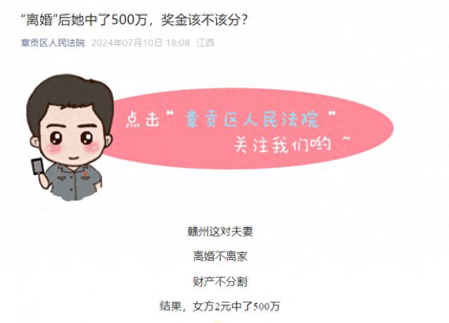 9 月 20 日前,江西章贡区人民法院公布了一起案例:赣州一对夫妇离婚不离家,资产不分割,结果,女方, 2 元中了 500 万。