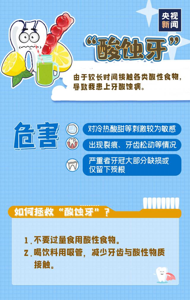 最初的表现就是牙齿表面脱矿变软,出现白色斑块,再严重一点就发展成“牙酸蚀症”。