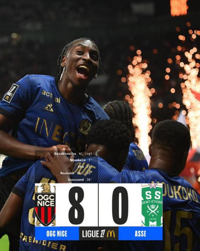 第 39 几分钟后,穆科科上演了两次梅开,尼斯半场。 6-0 结束比赛悬念。