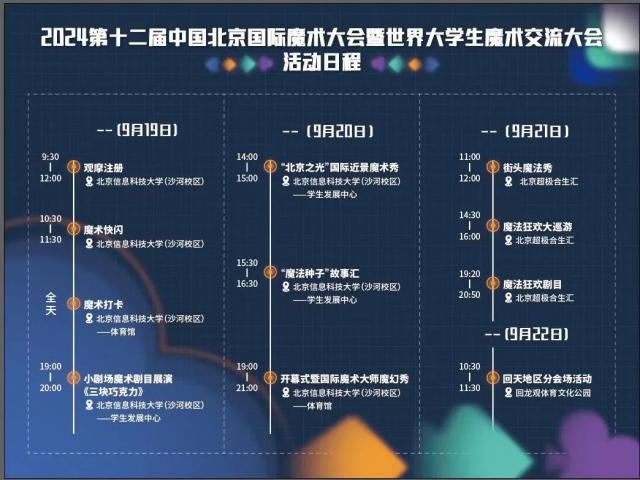 除北京信息科技大学(沙河校区)会场外,本次魔术大会还在北京超极合生汇、回龙观体育文化中心设立了分会场。9 月 21 2008年,街道魔术表演、法术嘉年华巡游、魔术曲目等表演内容将在北京超极和生汇分会场举行。同时,还将开展一系列促进消费的活动。大学生可以持学生证享受消费折扣,市民和游客也可以凭魔术大会开幕式门票到北京超极和生汇领取优惠礼包,进一步激活商业区的消费活力。