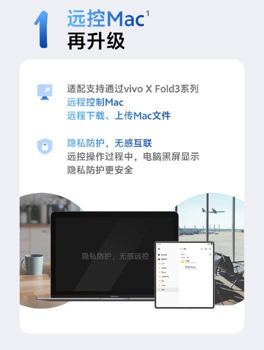 升级后的 vivo X Fold3 远程操作将得到支持 Mac 计算机设备。用户可通过手机直接远程下载和上传文件 Mac 计算机。另外,为加强对用户隐私的保护,在进行远程操作时,Mac 计算机屏幕将显示为黑色屏幕,避免其他人看到屏幕上的内容,从而保护用户的隐私和安全。