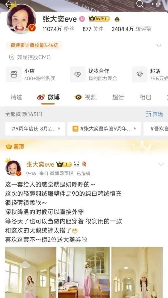 2014年,张大奕的网店“我快乐的衣柜”开业。同年,如涵成立,创始人冯敏担任董事长,获得A轮融资。“2016年‘我快乐’在‘双十一’的销量将突破1亿元。”刘若兰回忆说,张大奕在个人微博上吸粉,然后引流到淘宝店下单。她和如涵找到了一种非常划算的推广方式。