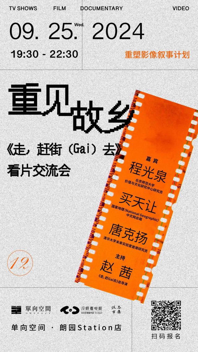 9 月 25 日(周三)19:30-22:30,重叙计划第 12 期邀请到了系列纪录片《走,赶街(Gai)去》来到单向空间 · 郎园 station 商店。北京师范大学价值文化研究中心研究员程光泉、国家地理(National Geographic)中文网总裁买天让、清华大学未来实验室首席研究员,美术学院,建筑学院博士生导师唐克扬及《走,赶 Gai 去》导演赵茜电影上映后,我们来谈谈这么大的中国,那些特别迷人的诗和远方。