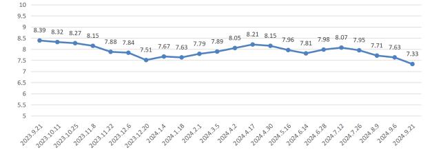 按照“十个工作日”的原则,下一轮成品油零售限价调整时间为10 月 10 日 24 时。