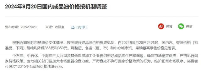 自 9 月 21 日零时起,92 号码汽油将减少到 7.33 元 / 升,95 号码汽油下降为 7.80 元 / 升,0 号码柴油下降为 7.00 元 / 升。