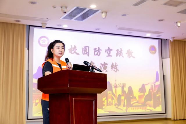 “同学们,我们的防空应急措施分为“鸣”、“走”、“藏”、“消”四个步骤。强大的祖国让我们处于和平的环境中。然而,国际形势复杂多变,国防安全的概念不可或缺。因此,人民防空的地位非常突出。每个公民都应该弘扬爱国主义精神,增强国防观念,自觉履行国防义务,关注、支持和参与国防建设。“许辰月向在场的师生详细阐述了不同类型的防空报警及其对应的紧急情况,包括预警、空袭报警、解除报警等知识,让师生能够准确识别并做出相应的反应。