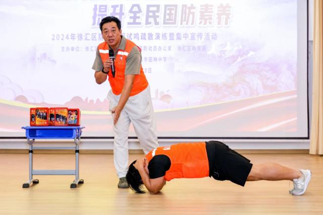 随后,来自上海市搜救队的单鸣华向学生们传授了轰炸时的隐蔽动作,并介绍了个人和集体在轰炸时应采取的保护措施,包括寻找隐蔽物体、迅速疏散到安全区域、保持理性等。,从而提高生存概率。单鸣华的技能教学并不局限于理论知识,还结合实际操作,邀请 7 学生上台合作,现场展示了很多应急技能,包括如何在紧急情况下保护自己,如何正确使用防护装备,如何有效疏散救援等。,从而增强师生的应急反应能力和自救互救能力。