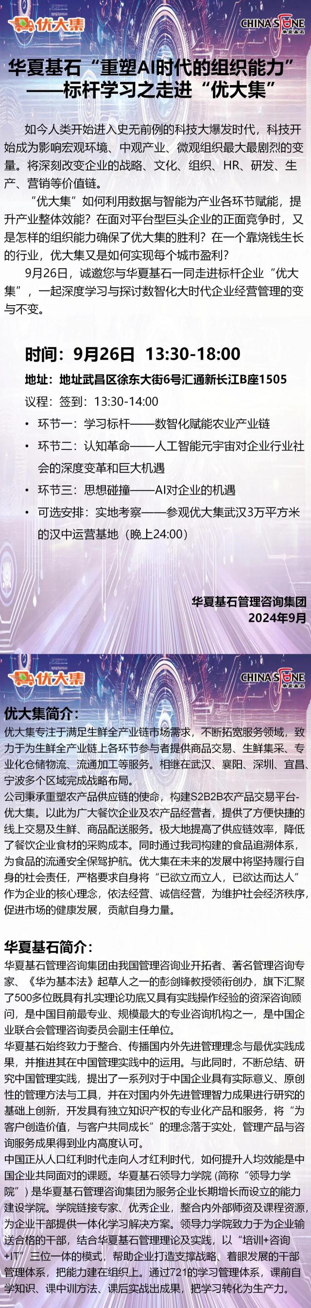 9 月 26 日本,诚邀您与华夏基石一起走进优秀企业“优大集”,共同深入学习,探讨数智化大时代企业经营管理的变化与不变。