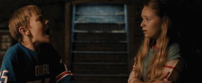 在地窖里,小男孩指着一张全家福,想告诉女孩这张照片隐藏的杀戮。