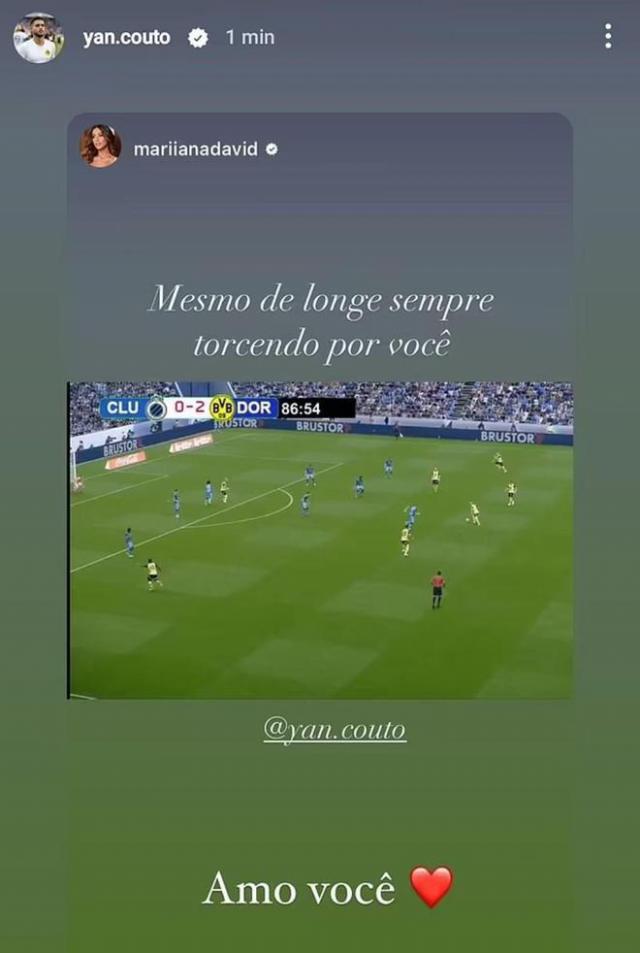 扬 - 玛丽安娜,科托的女朋友 - 大卫 ( Mariana David ) 在社交平台上,我拍了一张多特蒙德和布鲁日的比赛照片,给男朋友加油。她写道:“即使很远,我也会一直为你加油。”赛后,扬 - 科托转发了这个消息,并回答说“我爱你”。