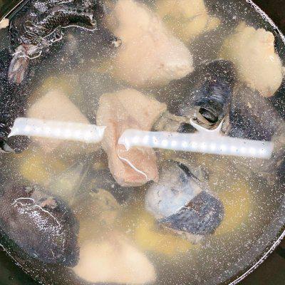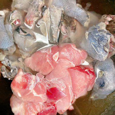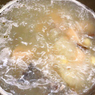 2、将米酒、乌骨鸡、猪展放入锅中,煮沸后煮沸。 3 几分钟,捞出备用