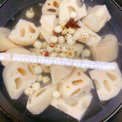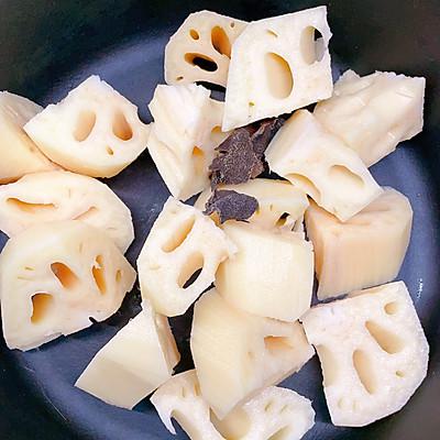 3、莲藕去皮后,滚刀切成块,与陈皮一起放入锅中