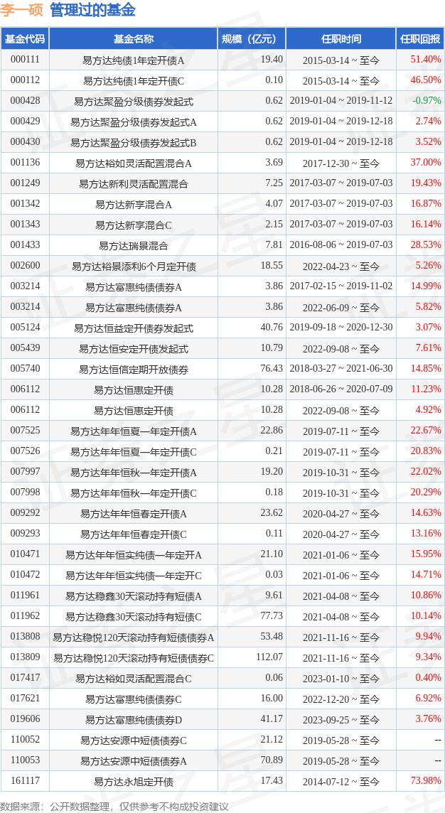 易方达恒益定债券发起基金主管变更:增聘李一硕为基金经理