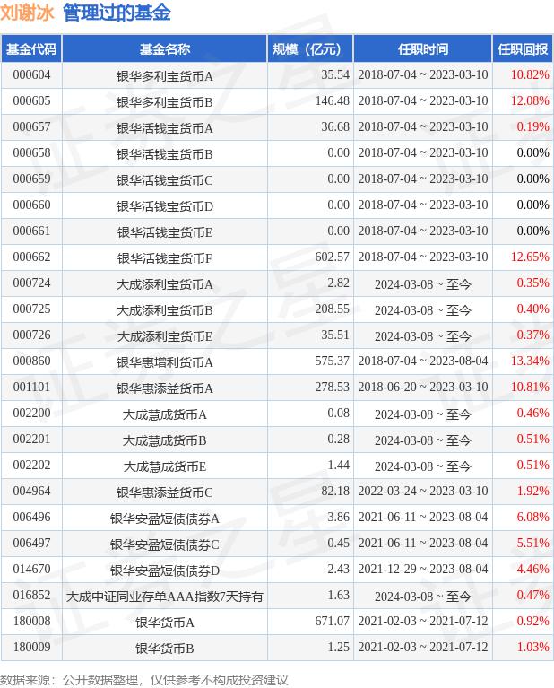 刘谢冰先生:中国国家,香港城市大学理学 ( 应用经济学 ) 硕士。2013 年 12 月至 2016 年 11 月任广发证券资金管理部高级交易员。2016 年 12 月至 2023 年 8 每月担任银华基金固定收益部基金主管。2023 年 8 每月加入大德基金管理有限公司,现任固定收益总部现金资产投资部副总监 ( 总监助理级 ) 。2024 年 3 月 8 任大德中证同业存单之日起任 AAA 指数 7 天持证券投资基金、大德慧成金融市场基金、大德添利宝金融市场基金主管。2024 年 5 月 14 日起担任大德金融市场证券投资基金、大德丰财宝金融市场基金主管。具有基金从业资格。