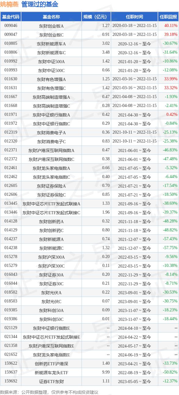 东财北证50A基金经理变更:增聘姚楠燕为基金经理