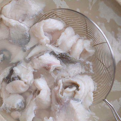 2、锅内烧开水,鱼肉放入锅中煮沸 20 秒,直到鱼卷起来,立即捞出控水。