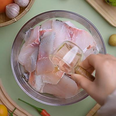 1、切好的鱼加盐、米酒、胡椒、蛋清、淀粉,拌匀腌制 5 分钟