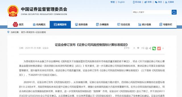 乐居财经 严明会 9 月 20 日本,根据证监会网站,证监会对《证券公司风险管控指标计算标准》进行了修订和发布, 2025 年 1 月 1 日起正式实施。