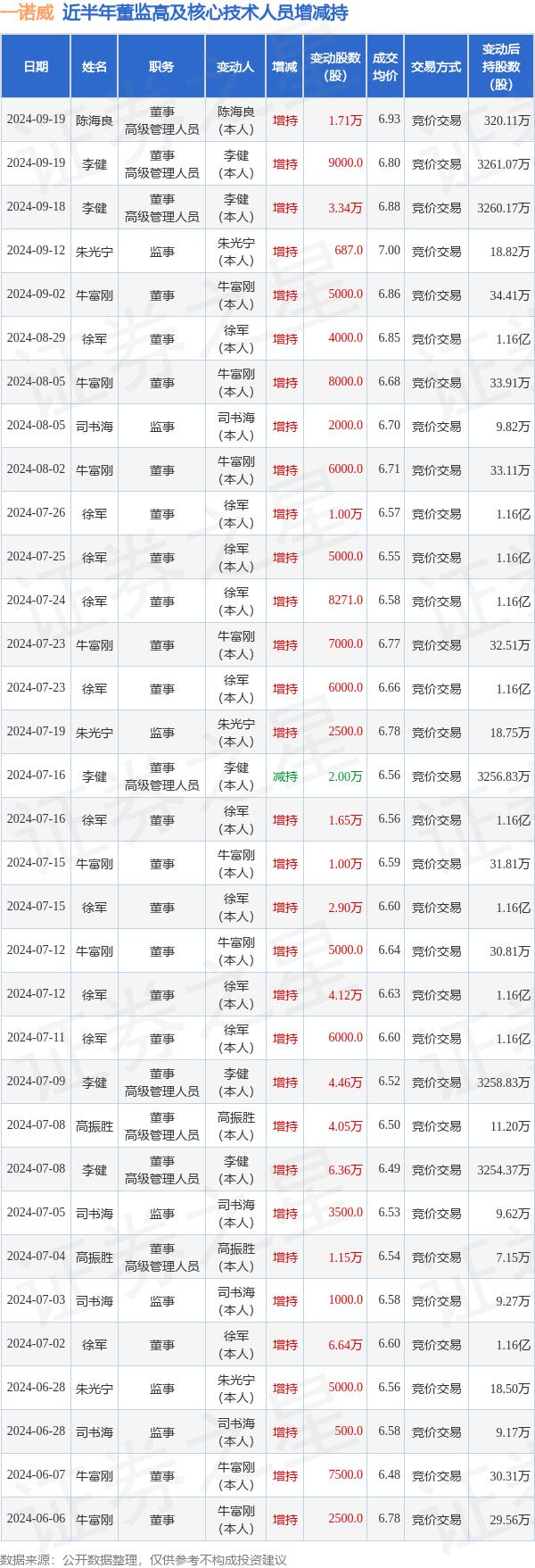 近半年来,一诺威董监高和核心技术人员的调整持有以下详细信息: