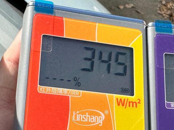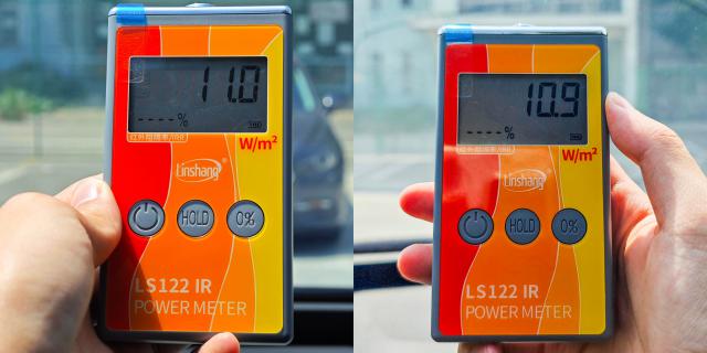 另外,我测量了一下,户外红外强度 300 多 W/㎡,贴了膜后在 11W/㎡上下,相差近 300 所以,没有贴膜或贴普通膜的车,效果更好。