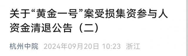 9 月 20 日,浙江省杭州市中级人民法院发布《关于“黄金一号”案件损害集资参与人资金退出公告(二)》,公布了涉案资金退出和退出方式。