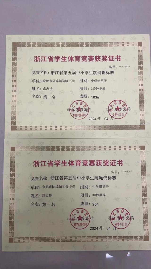 获得中学组男子 3 每分钟单摇第一名