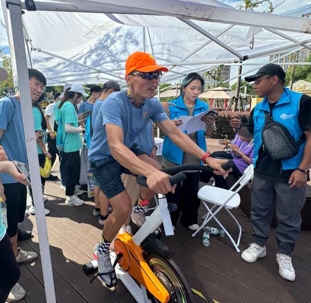 第二届松江咖啡黄金周,参赛选手林一鸣在五龙湖公园完成自行车骑行项目后,在各个咖啡摊前“打卡”纪念。“我是一个多年的运动爱好者。参加今天的定向比赛,不仅锻炼了身体,还体验了松江的文化贸易地标,感觉很有意义。”林一鸣说。