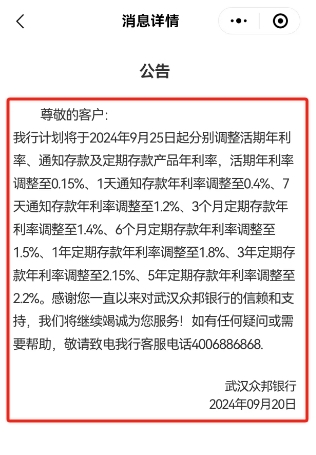 9月20日,武汉中邦银行股份有限公司(以下简称“中邦银行”)发布公告,计划从2024年9月25日起调整活期年利率,通知存款和定期存款商品年利率。值得一提的是,中邦银行早在8月底就已经提前降低了大额存款商品的利率。