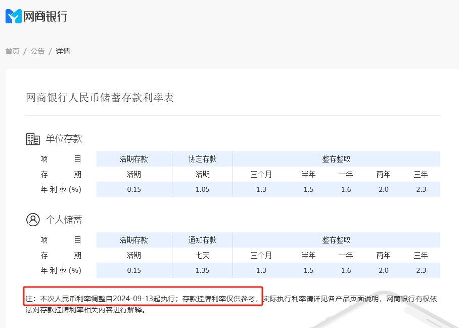 根据网商银行官网公告,该行将于2024年9月13日起实施新的人民币储蓄存款利率表。其中,三年期定期存款(整存整取)年利率已降至2.3%,两年期定期存款(整存整取)年利率已降至2.0%。