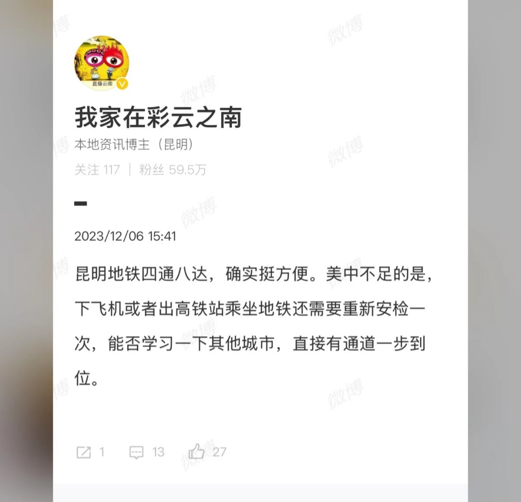此前网友发帖吐槽坐飞机或高铁到昆明出站换地铁需要二次安检。