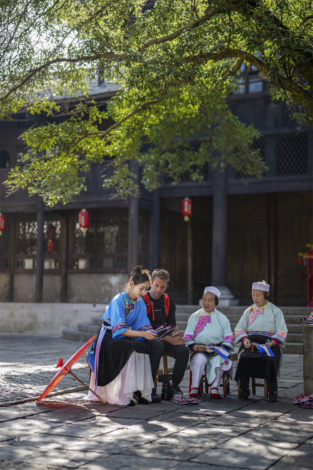 国家地理探险家兼摄像师本·霍顿学习传统刺绣技巧。黄斌 拍摄