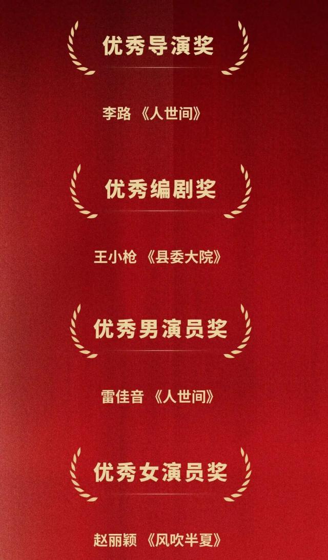 在几个主要奖项中,赵丽颖凭借《风吹半夏》获得观众奖后,雷佳音凭借《世界》获得观众奖,李路凭借《世界》获得优秀导演奖,王小枪凭借《县委大院》获得优秀编剧奖。