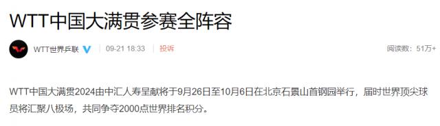 2024 年乒乓球 WTT 即将举行的中国大满贯赛 9 月 26 日拉开序幕。目前,世界乒乓球联合会已经公布了完整的参赛名单,各协会选手的阵容已经正式确定。作为东道主,郭萍这次总共有多少? 32 排名选手,15 对于双打组合出场,人数高居各队之首,的确是声势浩大。