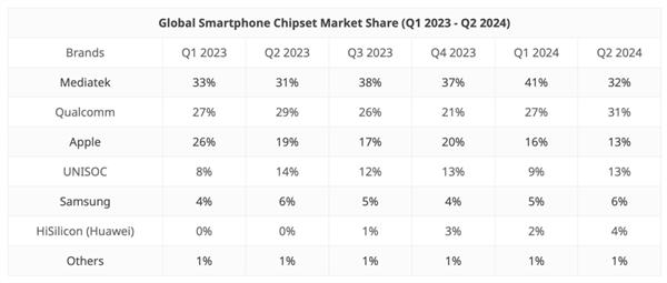 同时,MTK和高通各自占据了自己的位置。 32% 和 31% 这个份额仍然排在前两位。然而,两者之间的差距明显缩小,从上一季度开始 14% 缩减至 1%。这些表明,手机芯片市场的竞争格局正在发生变化,各厂商之间的差距逐渐缩小。