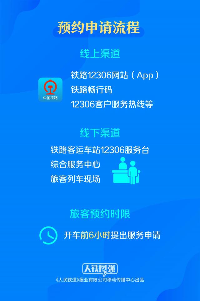 第三,规范预约申请流程。拥有铁路有效票的独特重点旅客可以通过铁路 12306 网站(App)、12306铁路畅通码, 在线渠道,如客户服务热线,或车站 12306 线下门店如服务台、综合服务中心、列车长等提出预约申请,预约时应提交相关出行信息、服务需求及有效证明材料。旅客预约时限进一步放宽,由“乘车站列车开车前” 72 调整到“开车前” 6 在预售期间,小时到“。 开车前距离不够 6 一小时,可以到达车站 12306 服务台、综合服务中心现场提交申请,原则上办理时限不晚于开车前。 60 分钟。铁路部门在收到预约申请后,会及时对受理情况进行审查和反馈,符合条件的,按规定做好服务工作。