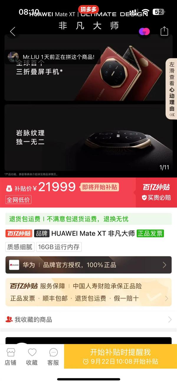 现在,华为已经在拼多多上架了。 Mate XT 非凡大师,发布时间与华为官网一致。