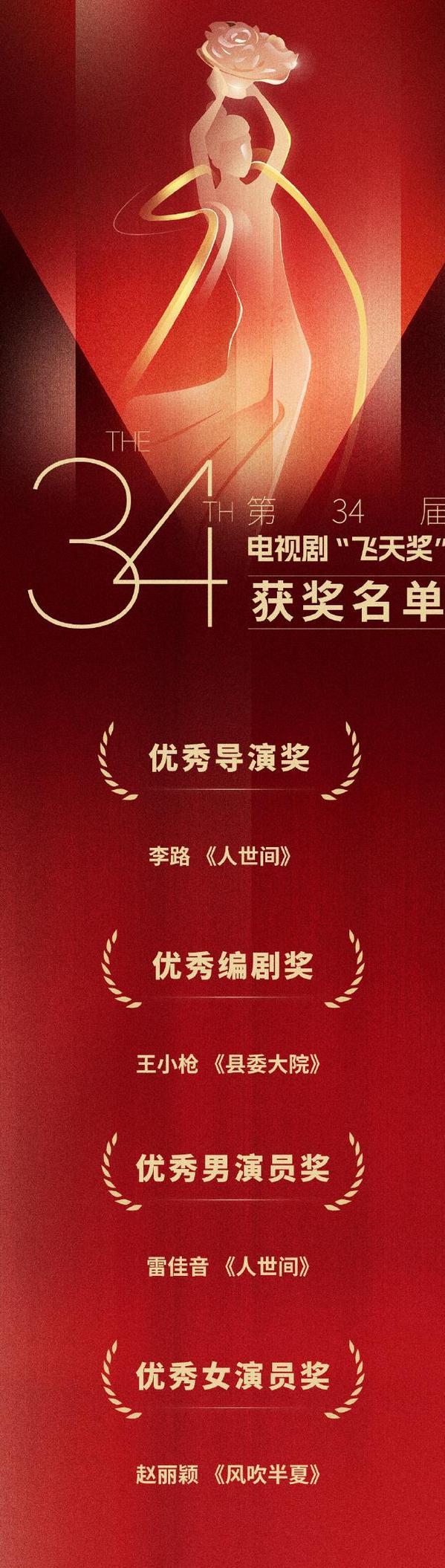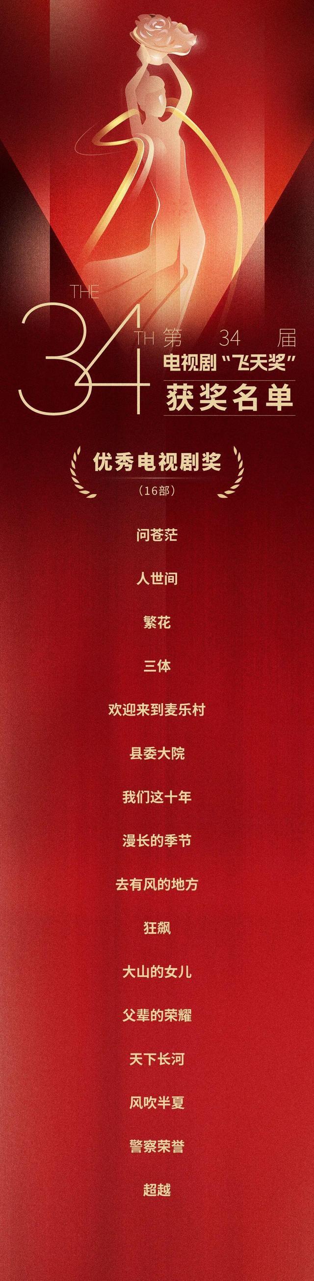 9 月 21 日晚,第 34 “飞天奖”颁奖典礼举行。揭晓获得本届“飞天奖”的公告。 16 一部优秀的电视剧,优秀的导演,优秀的编剧,优秀的演员,优秀的女演员。 4 获得单项奖的人。