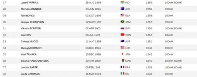 另外,林雨薇在巴黎奥运会上表现不佳, 1209 分排名第 59 位,亚洲第 六。另一个备受瞩目的人 100 米栏美女夏思凝,排在世界千人之外,排名第一。 155 位,亚洲第 17。
