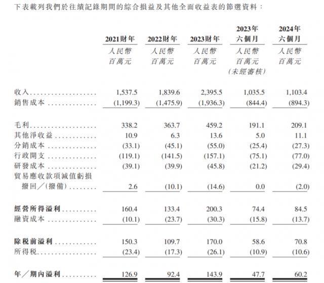 2021 年到 2024 年上半年,海螺材料科技实现收入分别为 15.38 亿元、18.40 亿元、23.96 亿元及 11.03 一亿元。同期,每年的溢利分别约为 1.27 亿元、9240 万元、1.44 亿元及 6020 万元。